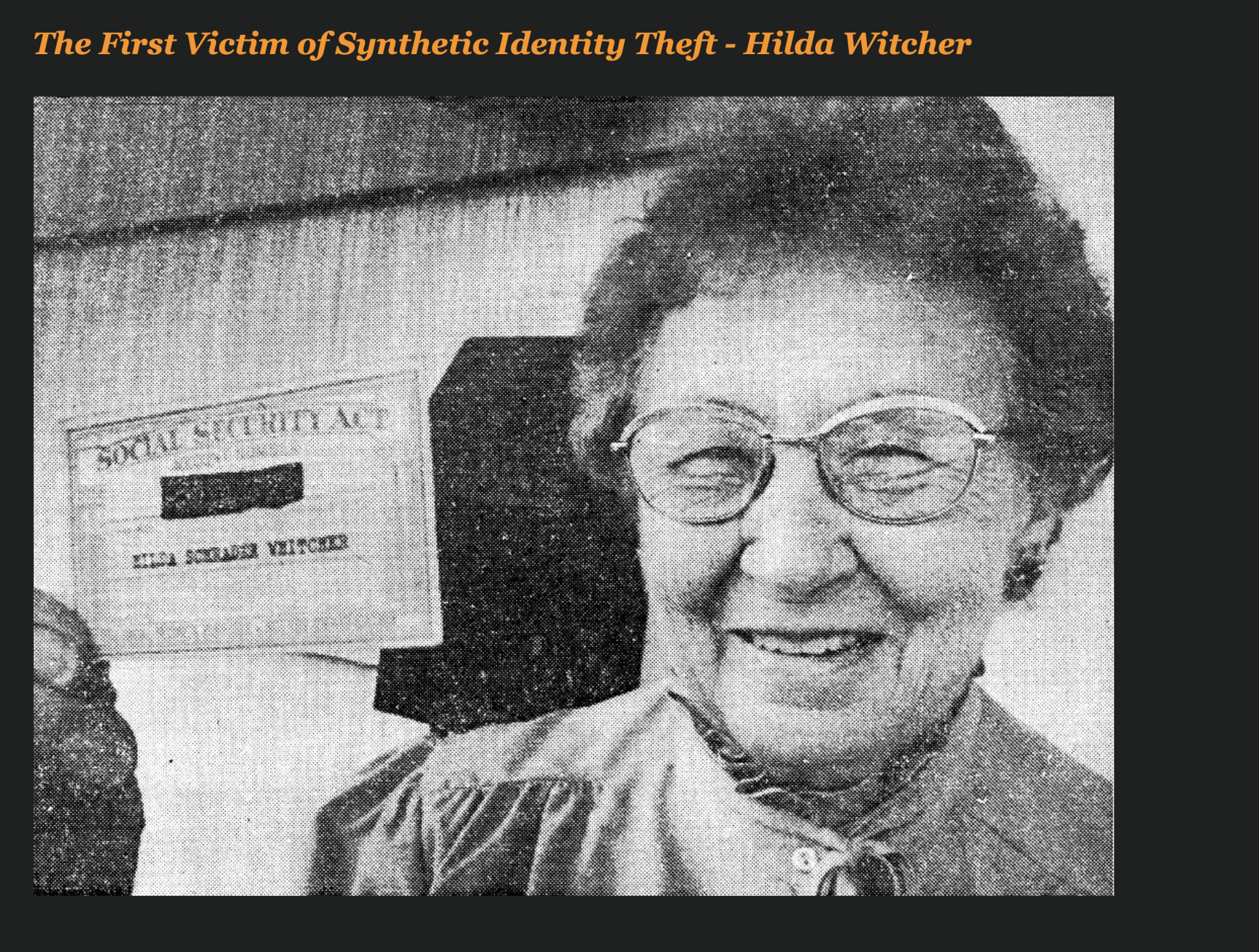 In the peak year of 1943, 5,755 people were using Hilda’s numbers — more than any other social security number in history, making Hilda the most stolen synthetic identity of all time.