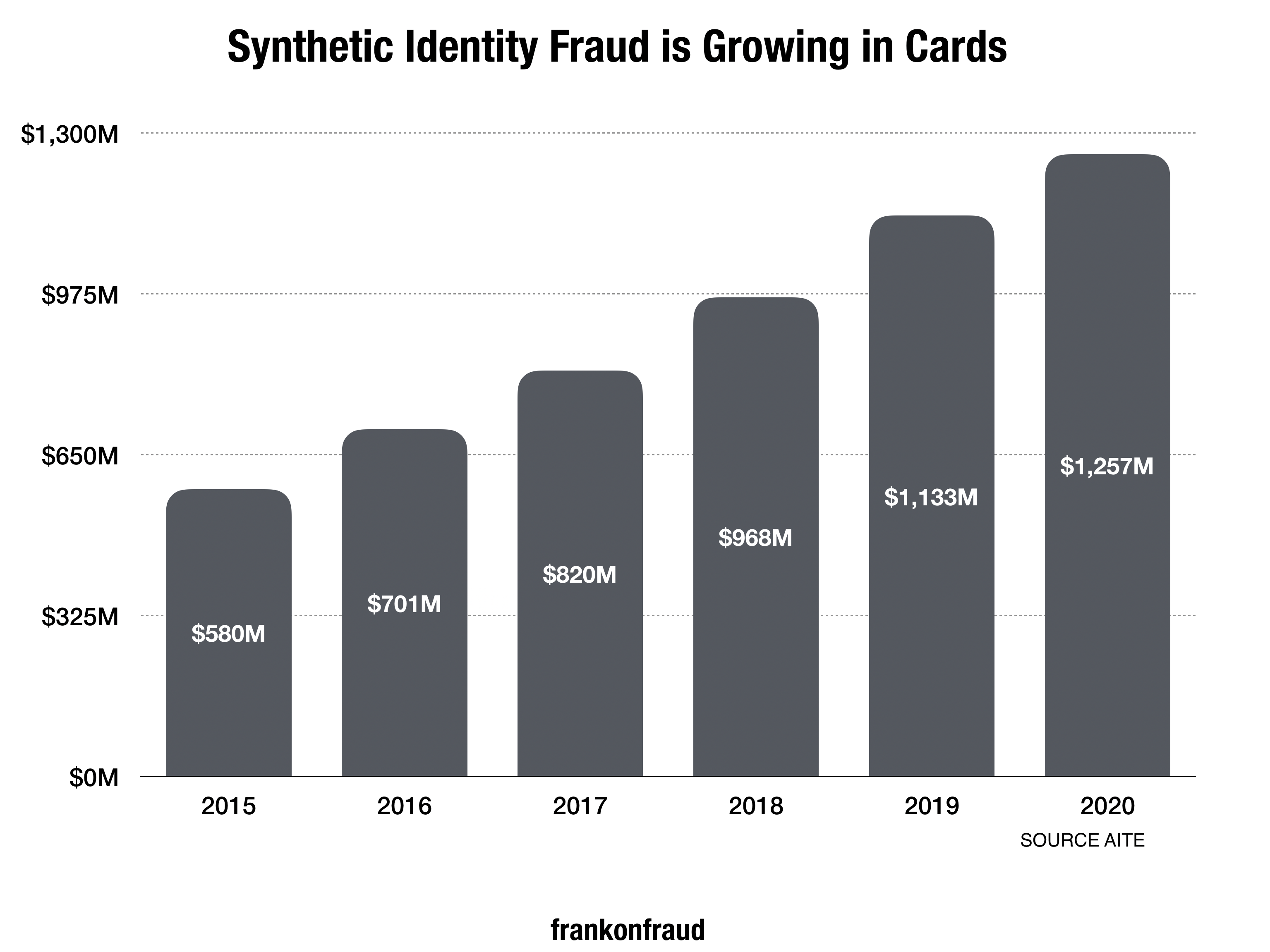Aite published analysis that suggest that synthetic identity fraud is growing at a rate of about 20% every year on card portfolios. By 2020 it is expected that card issuers will lose about $1.2 billion due to synthetic identities.