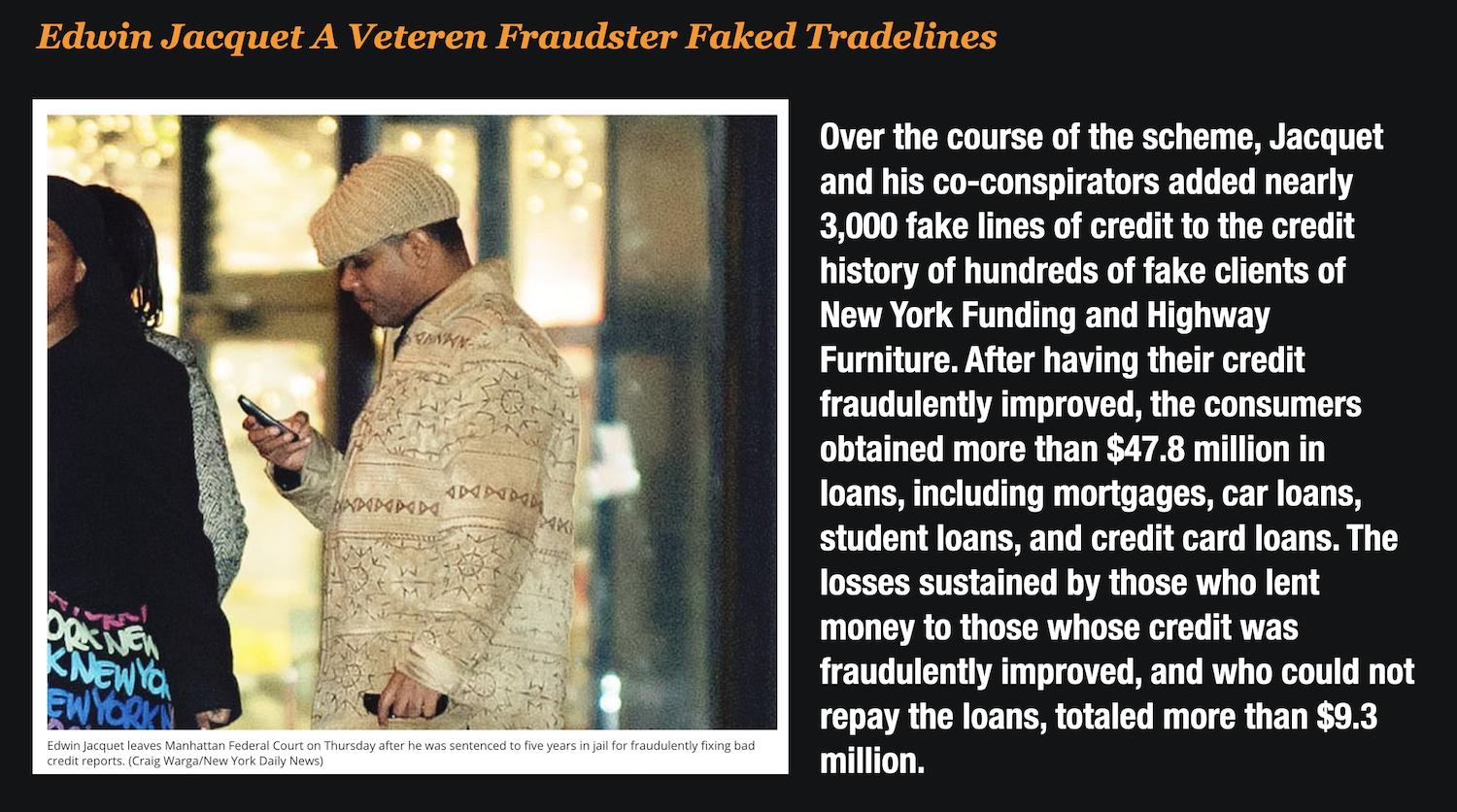 The fraud ring created two companies Highway Furniture and New York Funding with the intent to add fake tradelines to their clients accounts.
