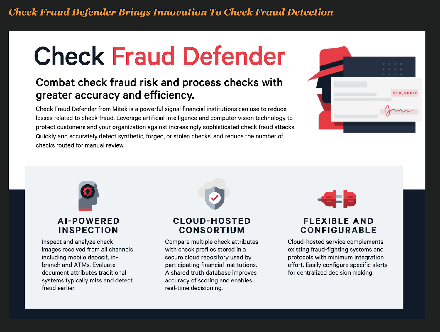 In June of 2021, Mitek broke through the check fraud doldrums by announcing the launch of their Check Fraud Defender solution. It introduced two new advancements in check fraud detection that move the needle in my opinion;