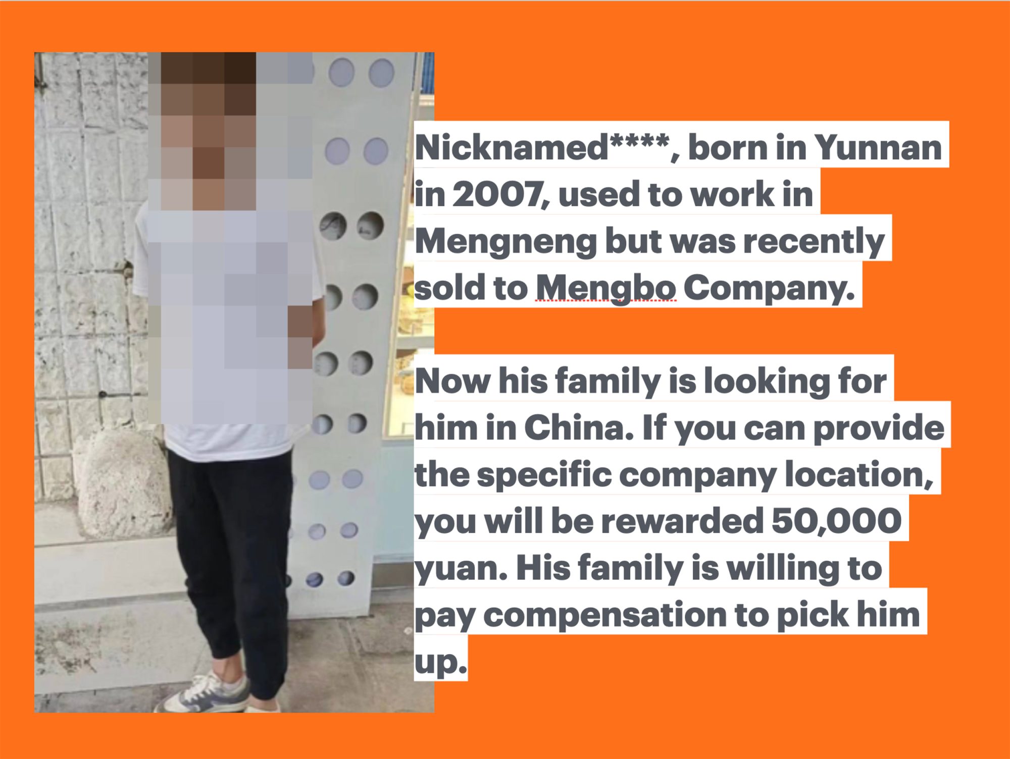 The ad reads, “Meng Bo’s little sister escaped. They are all Laotians. The reward for catching her is 30,000 yuan each if the valid location is provided, and the reward for sending the person to her is 50,000 yuan each.”