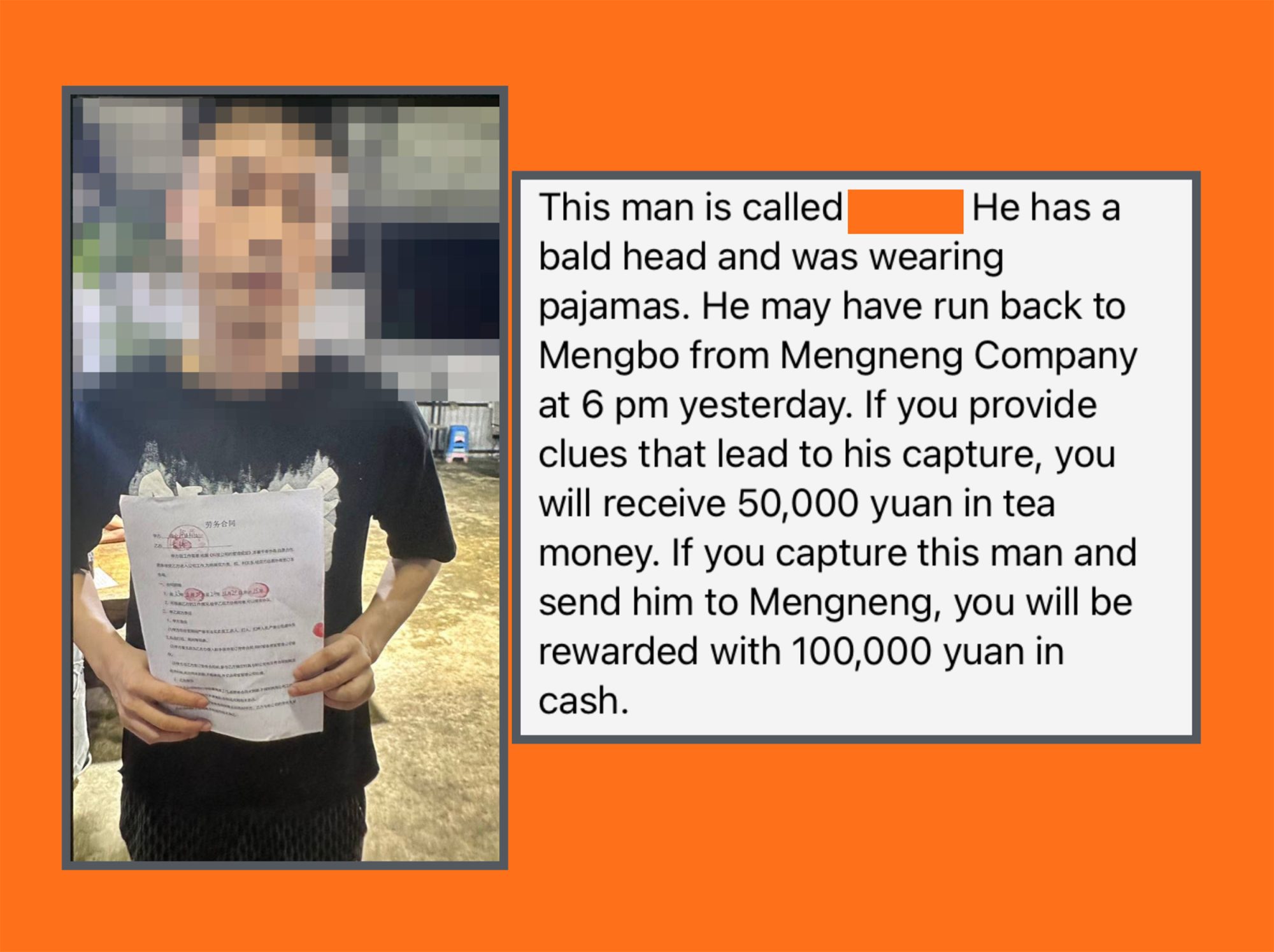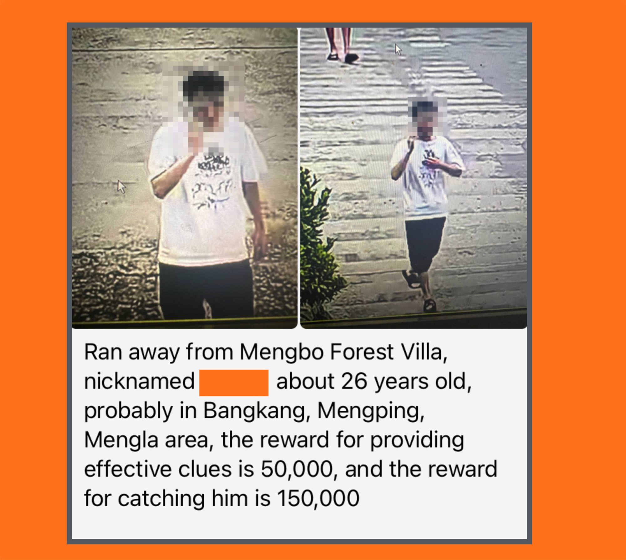 “He ran away from Mengbo Forest Villa, nicknamed *****, about 26 years old, probably in Bangkang, Mengping, Mengla area, the reward for providing effective clues is 50,000, and the reward for catching him is 150,000.