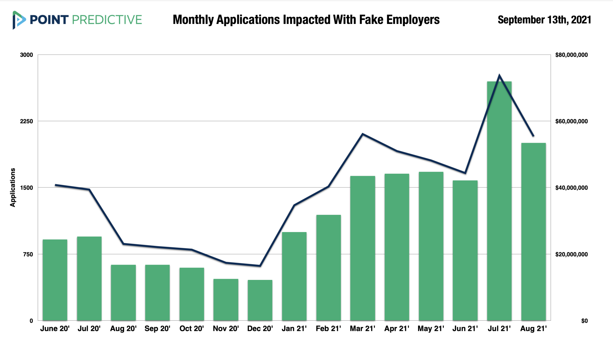 The indirect nature of auto loans makes the industry a prime target for these new fraudsters, McKenna said. In fact, monthly auto loan applications listing fake employers spiked just over $70 million in July, and has been over $40 million since March, according to Point Predictive data provided to AFN.