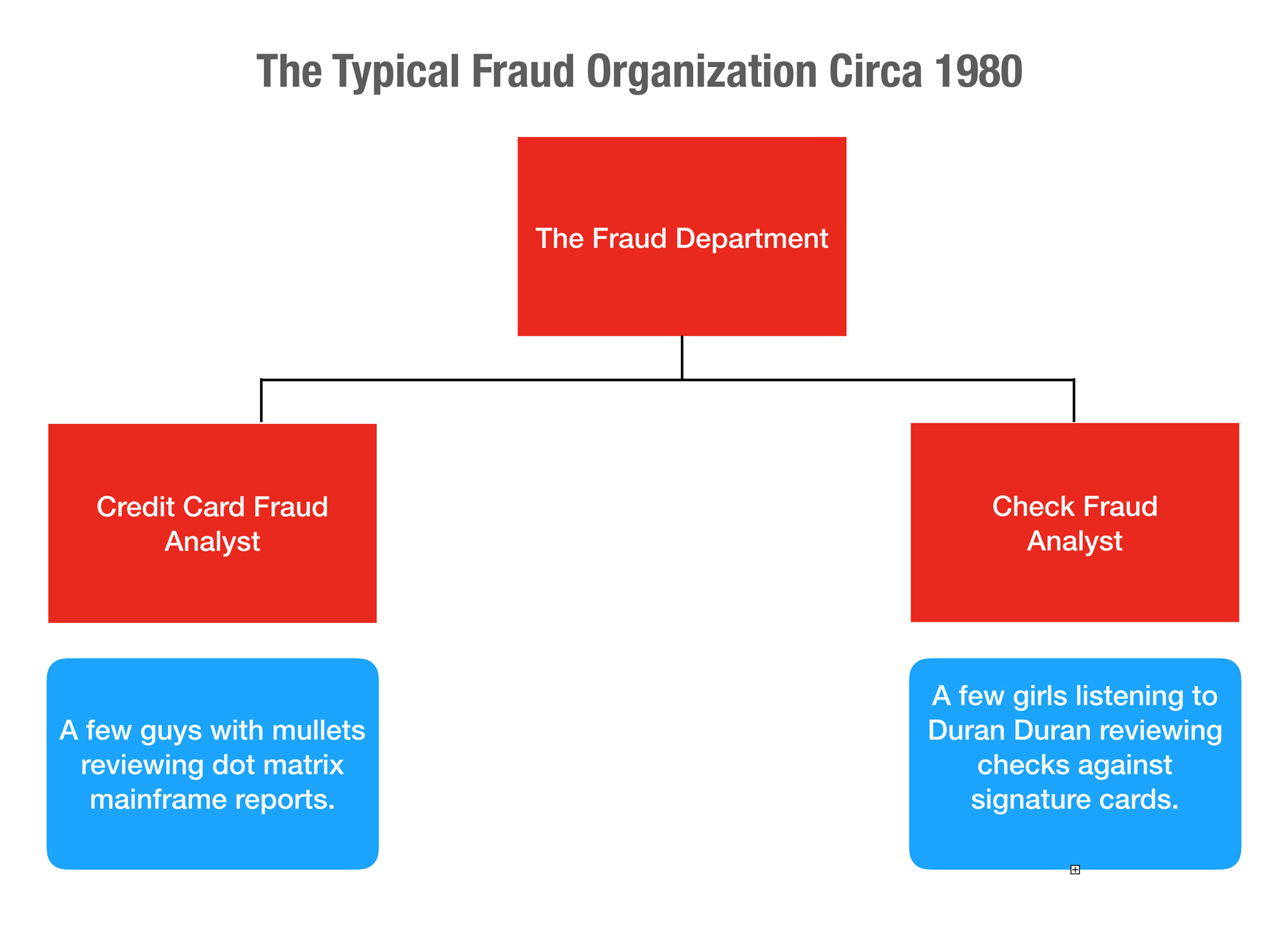 When I started as fraud manager, the fraud department was pretty small. You had your Check Fraud Team and you had your Credit Card Fraud Team. The teams were small, and the problems were small. We used to have Pizza parties and take lots of breaks.