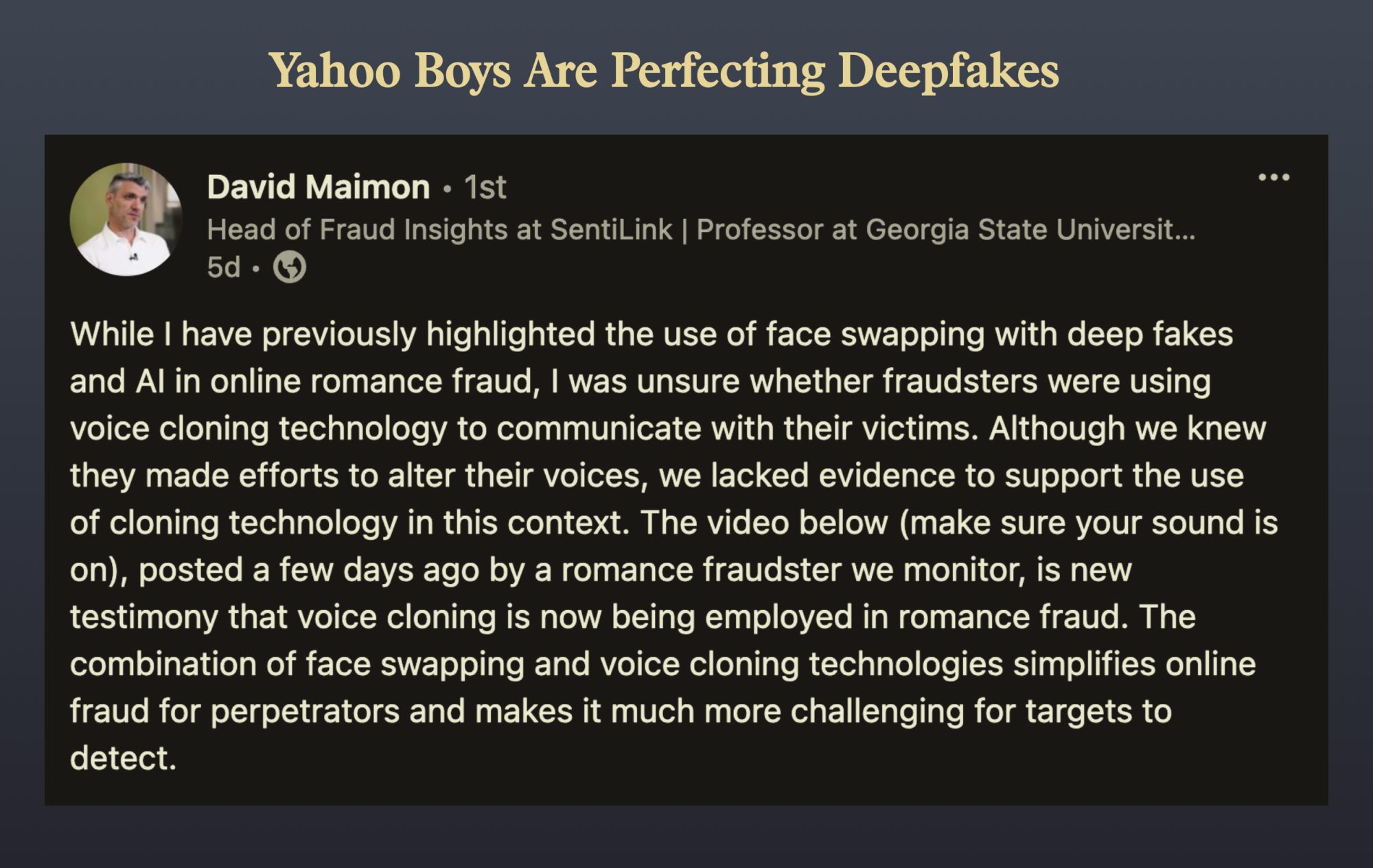 Don’t look now, but the Yahoo Boys are getting pretty good at perfecting their deepfakes, making them more believable by the day.