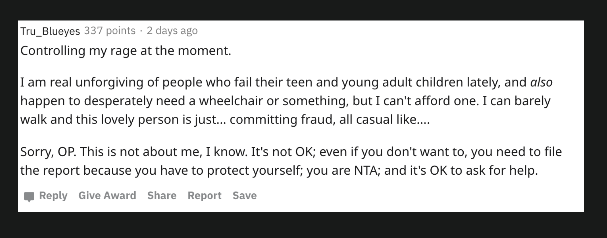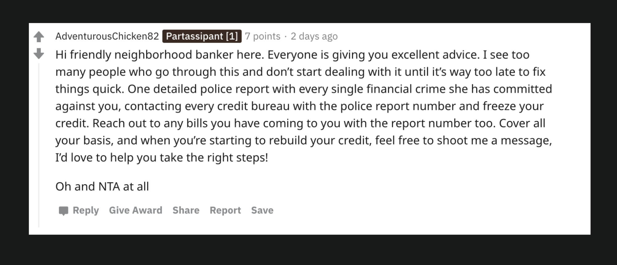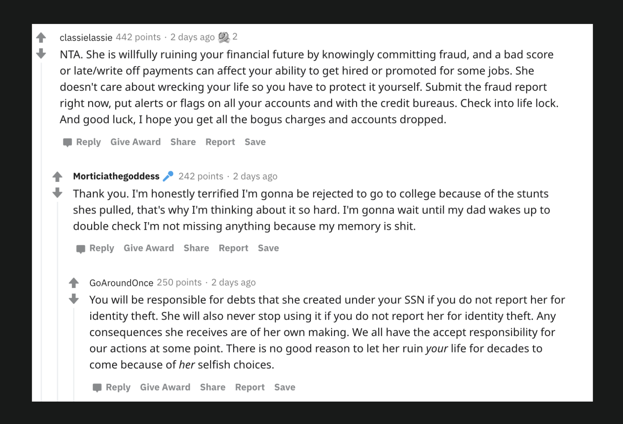Morticia’s mother stole her identity, and Morticia was so torn up about it, that she wrote a post on AITA (Am I The A**hole) to see what other Redditors thought.