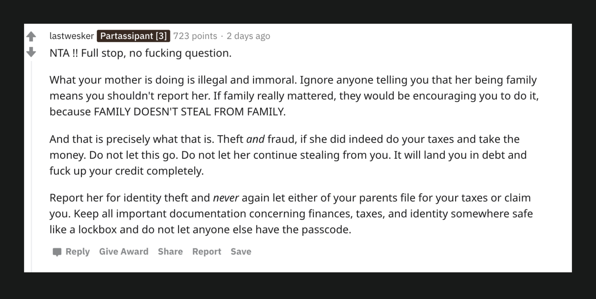 One Reddit User – MorticiaTheGoddess – had to ask the internet for help when her Mom stole her identity and wrecked her credit score. She was so torn up with guilt and confusion. Should she turn her mother in? Should she just brush it off?