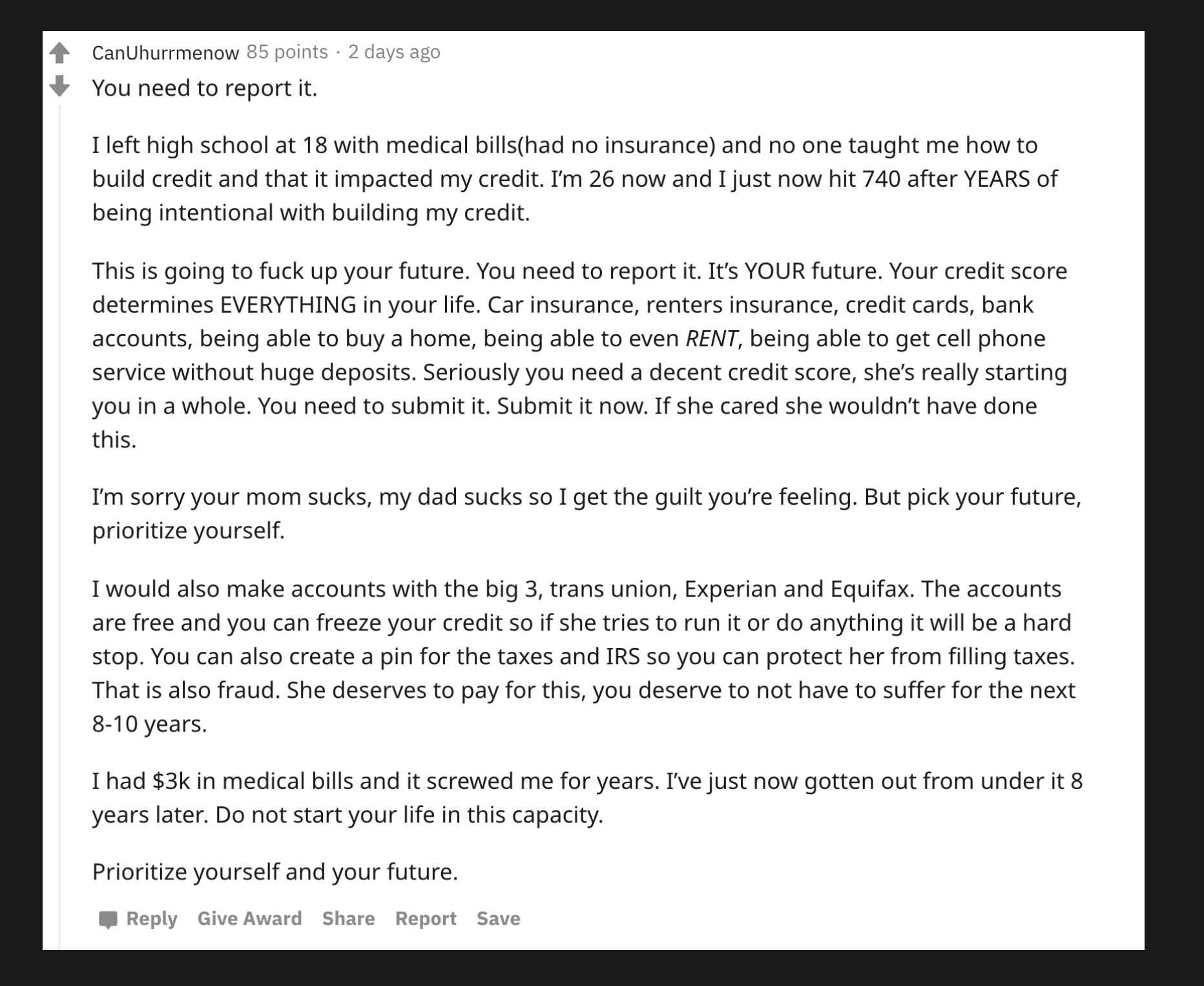 - Freeze your credit – This will protect you from your mom using your credit more.