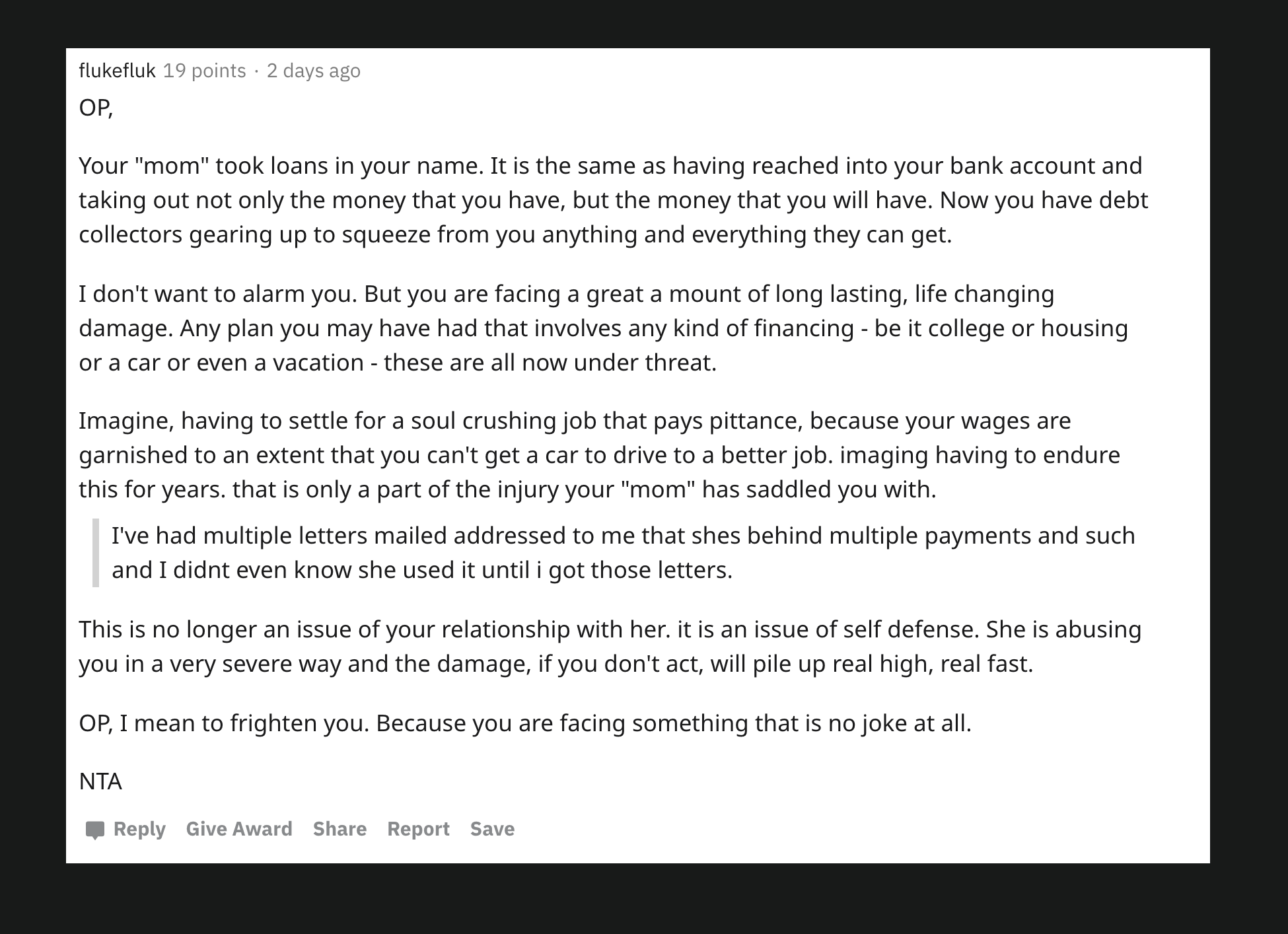Flukefluk didn’t beat around the bush and advised Morticia, that her mother applying for a loan with her SSN was like she “reached into her bank account” and stole the money. It’s true actually.