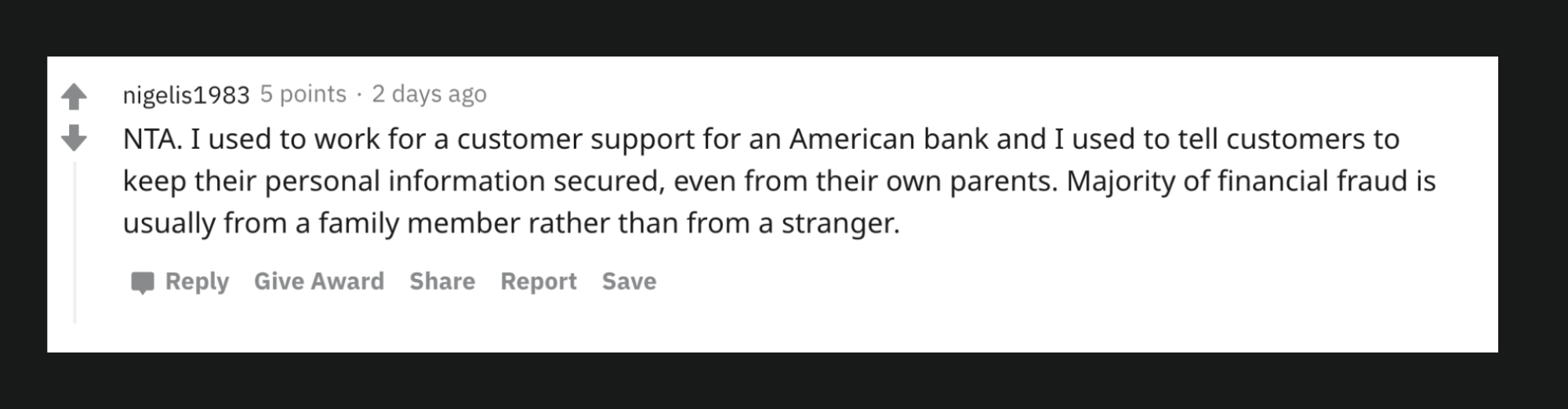 One poster who used to work for AMEX offered some chilling insight. When they were a customer support representative for AMEX they understood that a majority of fraud doesn’t happen from strangers, it is usually a family member.