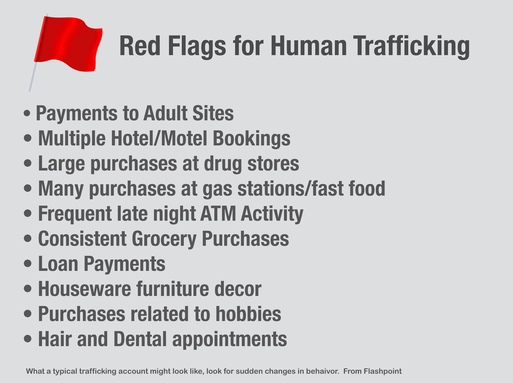 Fraud teams and AML Teams need to work together to identify and stop human trafficking.  Most human trafficking indicators will span the spectrum from fraud to anti-money laundering.  Establishing a task force between those two groups within your organization is critical.