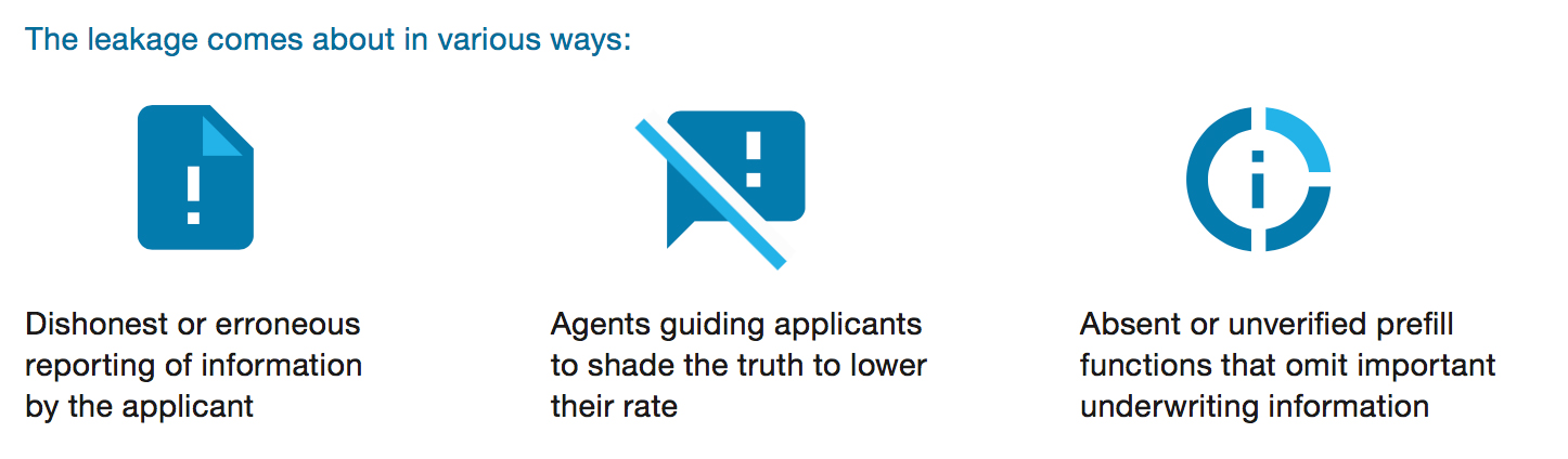 - Consumers– Dishonest or erroneous reporting of information by the applicant to lower their premiums.