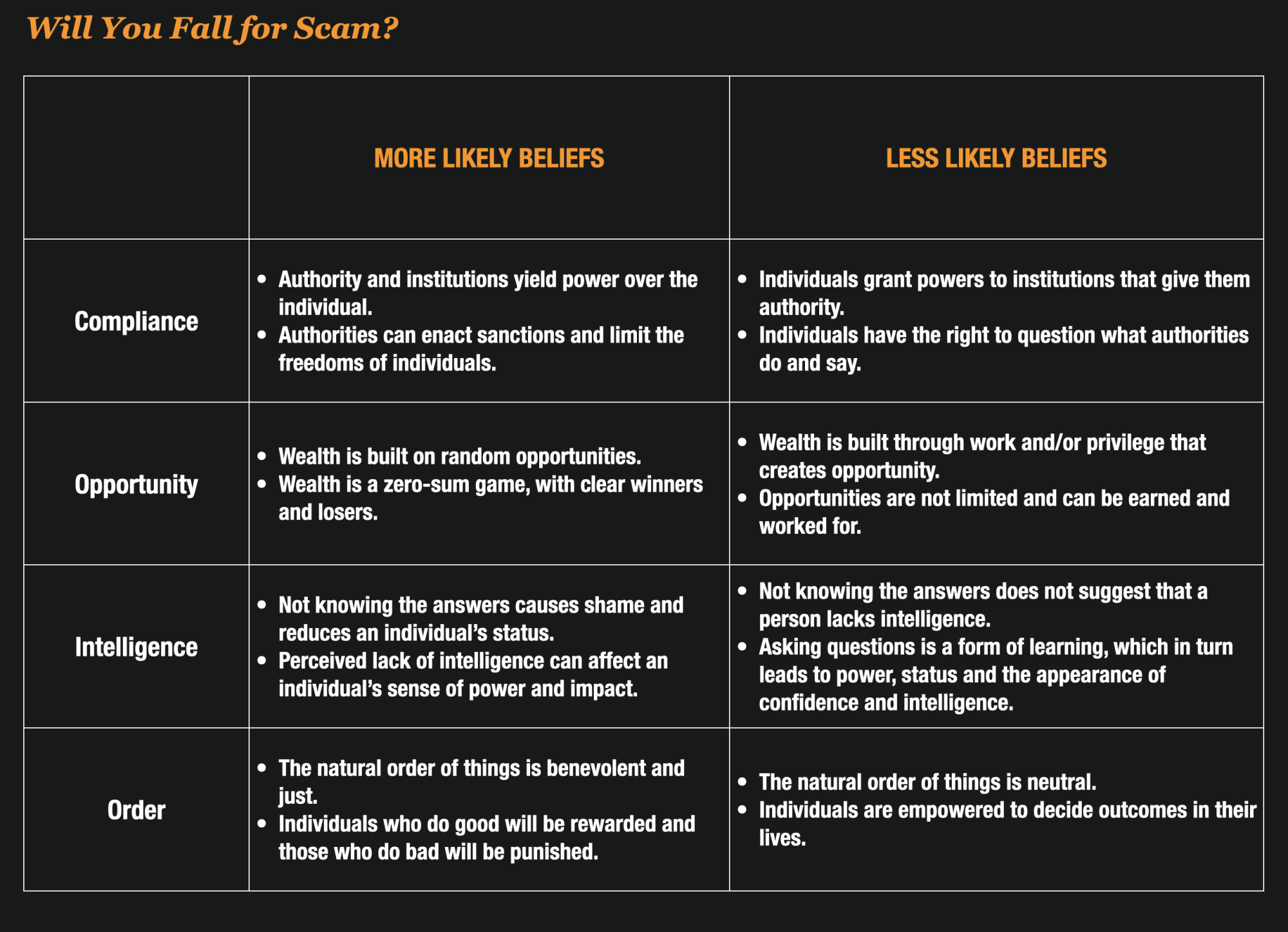 Researchers concluded that 4 particular beliefs were core to whether a person would fall for a scam. If the person held certain beliefs in these areas, they were more likely to be scammed.