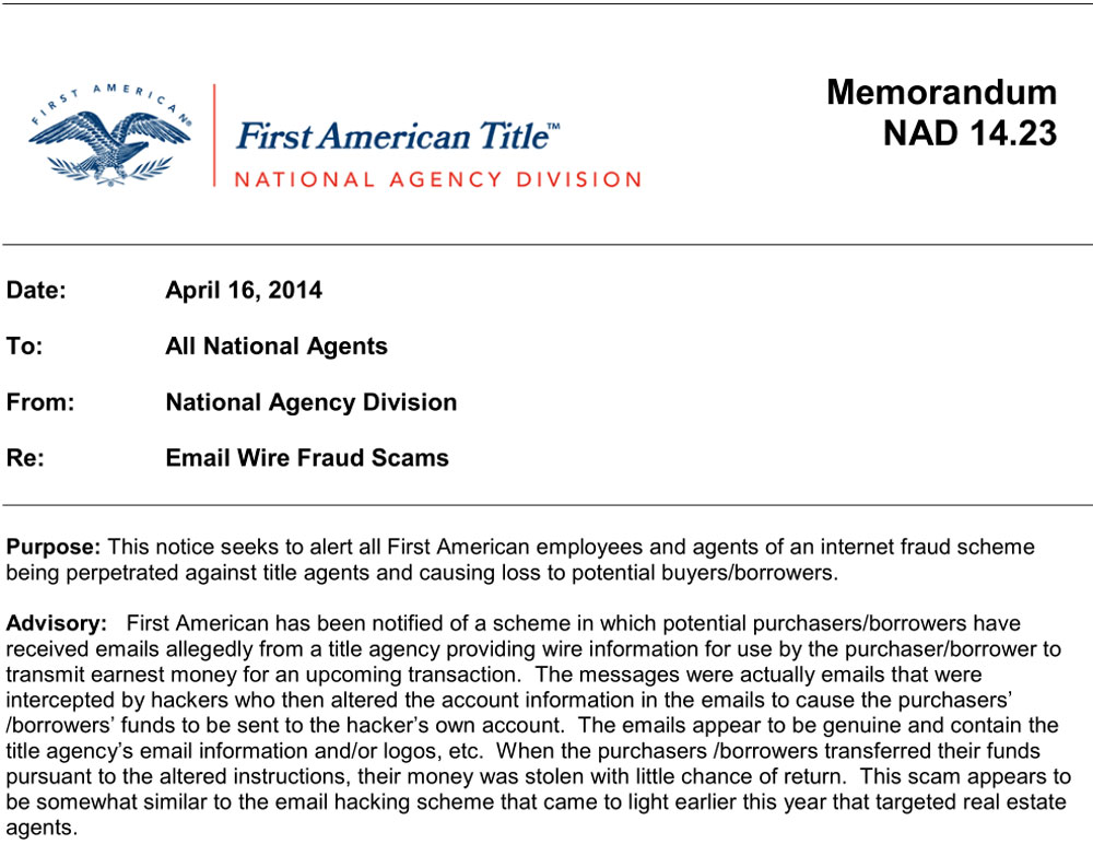 First American published notices about this scam back in 2014 when they saw it emerging. They notified real estate agents nationwide to be on high alert for these phishing and hacking scams that could cost their customers money.