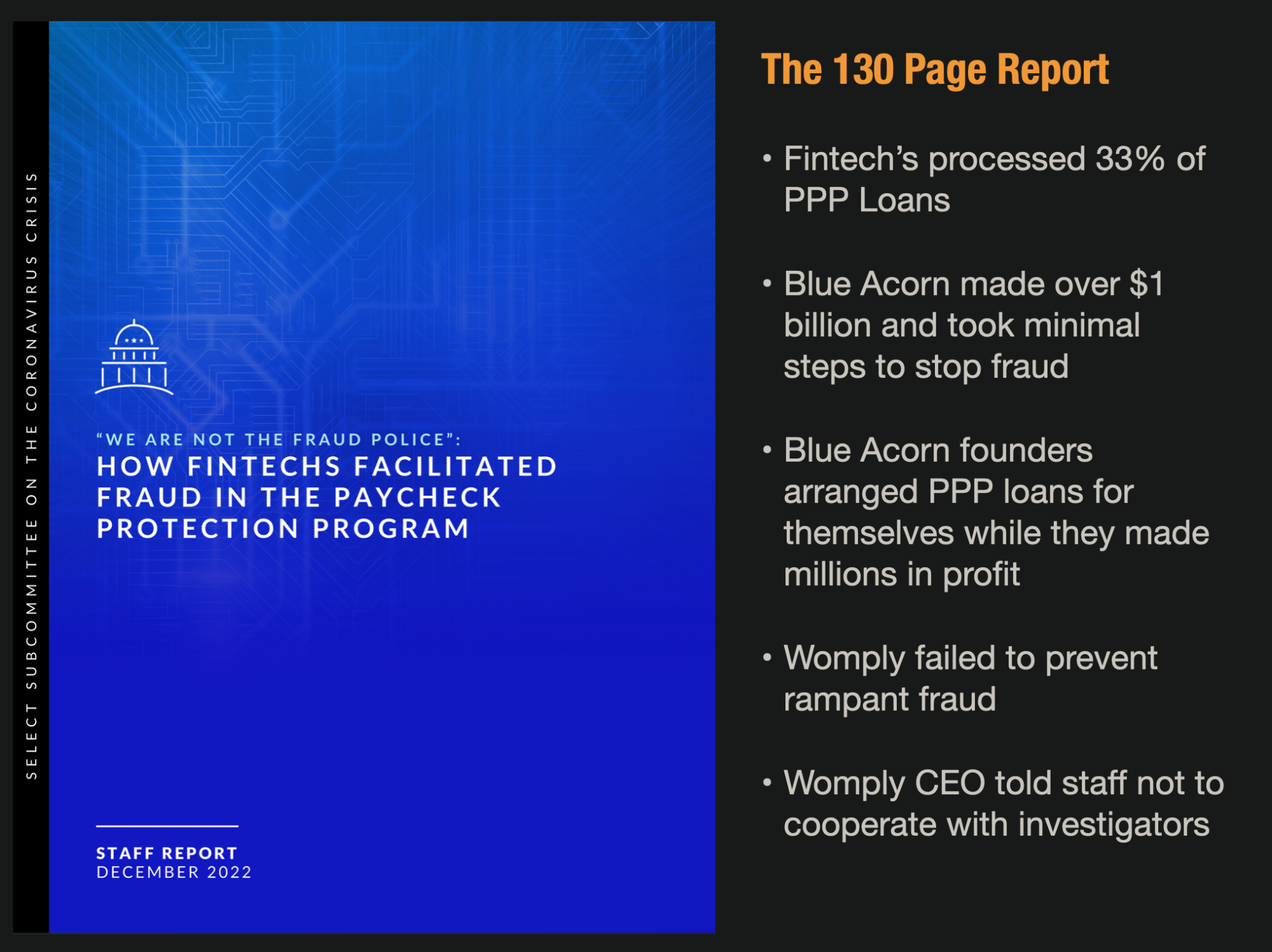 The report, titled “We’re Not The Fraud Police – How Fintechs Facilitated Fraud in The Paycheck Protection Program” is a 130-page report and the product of an 18-month investigation by the House Select Subcommittee on the Coronavirus Crisis.