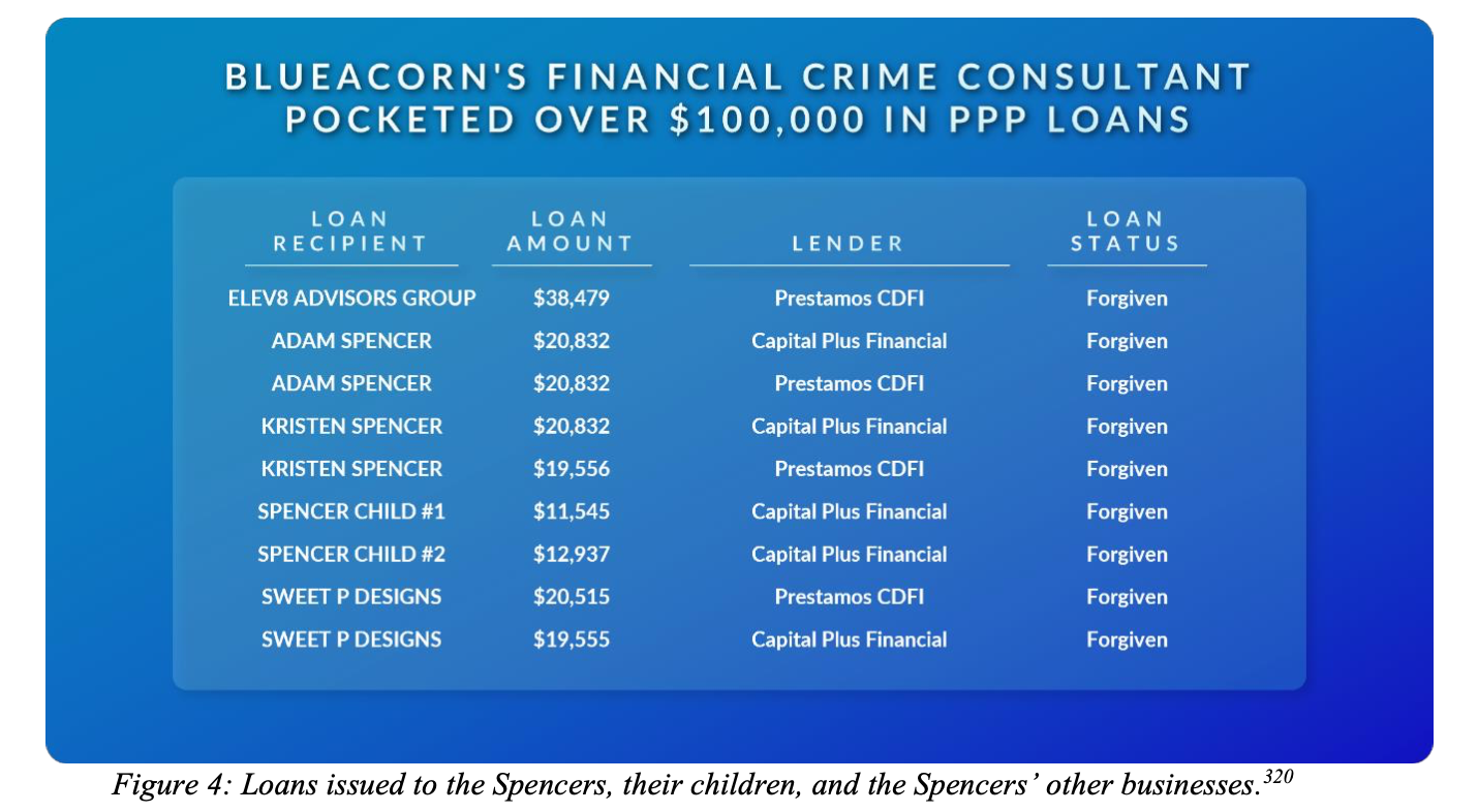 Blueacorn received over $1 billion in taxpayer-funded processing fees but spent little on fraud prevention and eligibility verification. Blueacorn received over $700 million in fees from Prestamos and over $385 million in fees from Capital Plus for their underwriting and other PPP facilitation services.