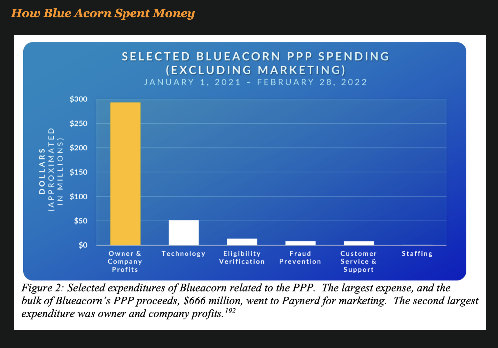 Blueacorn gave nearly $300 million in profits to its ownership while only spending $8.6 million—less than one percent of the fees it received for its PPP work—on its fraud prevention program. Blueacorn also gave approximately $666 million to a marketing firm controlled by members of its senior leadership—almost 50 times more than the $13.7 million the fintech spent on eligibility verification.