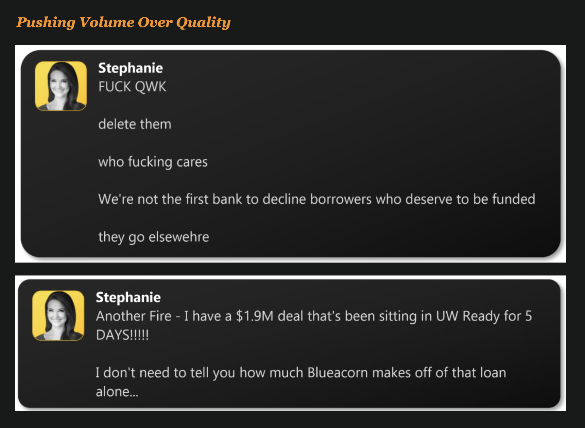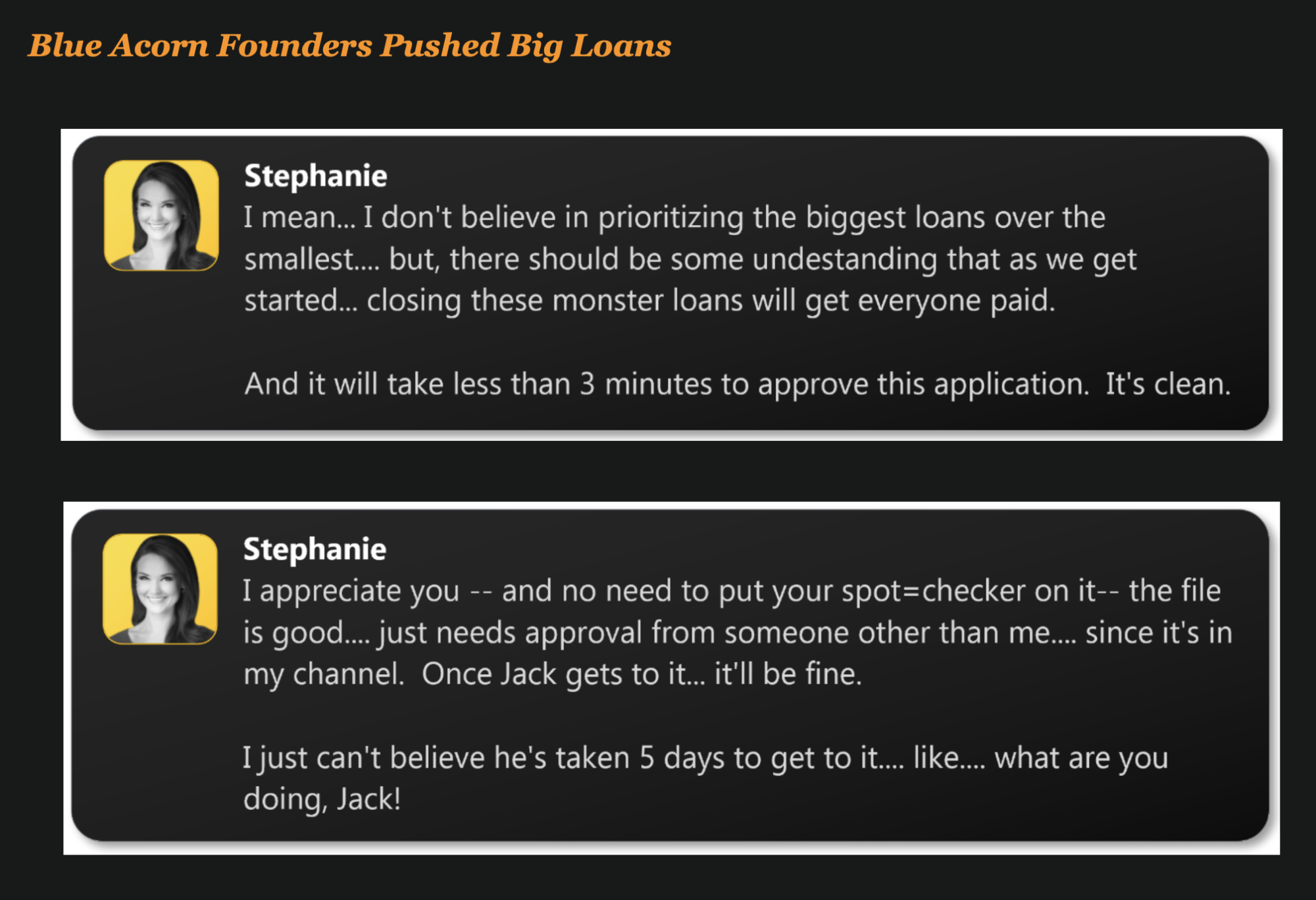 While prioritizing “VIPPP” loans, Blueacorn’s owners were dismissive of other loans, writing “delete them,” “who fucking cares,” and “[w]e’re not the first bank to decline [PPP] borrowers who deserve to be funded … they go elsehwere [sic].” In addition, according to their former business partners, Blueacorn founders Nathan Reis and Stephanie Hockridge attempted to directly charge some applicants a 10 percent fee for successfully procuring PPP loans—in violation of SBA rules.