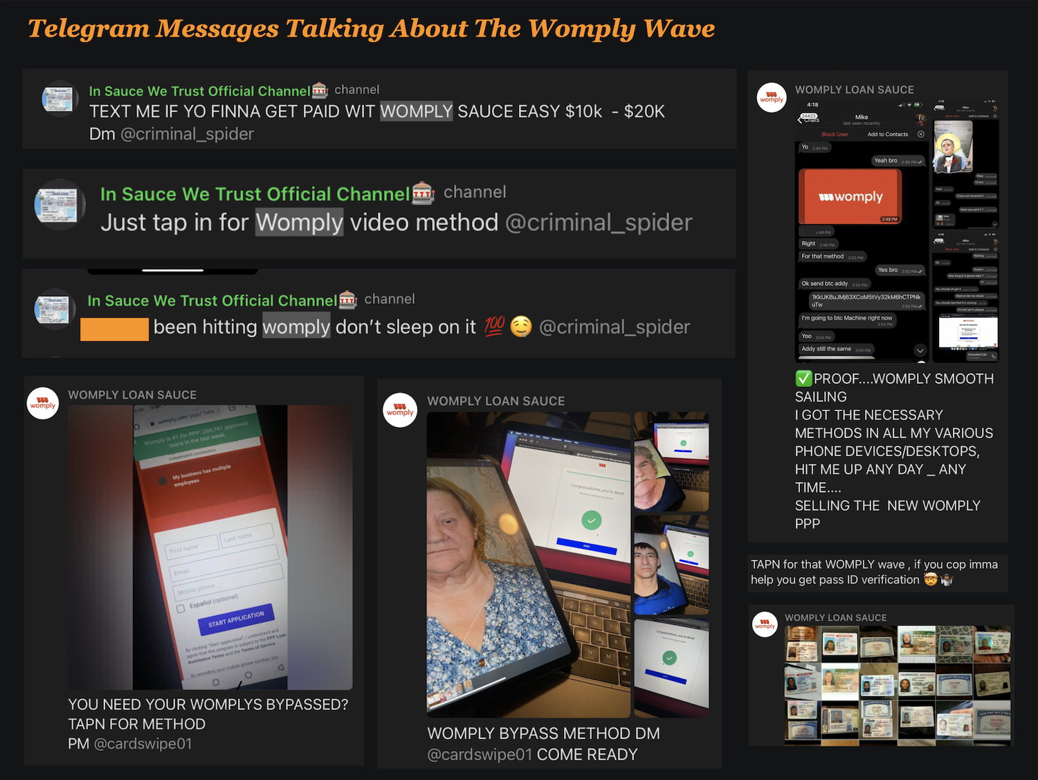 Criminals specifically targeted Blueacorn, Womply, and other fintechs to commit PPP fraud. Fraudsters discovered that Blueacorn and Womply were among the easiest companies to apply for fraudulent PPP loans due to the ease of securing a loan through either company. Members of drug gangs in Florida that were involved in PPP fraud were recorded by police discussing Womply and Blueacorn. One gang member asked another to “show me Blueacorn” while another described Womply as “the website that[’s] [] really hittin…’” and that “everybody in the hood” was using Womply.