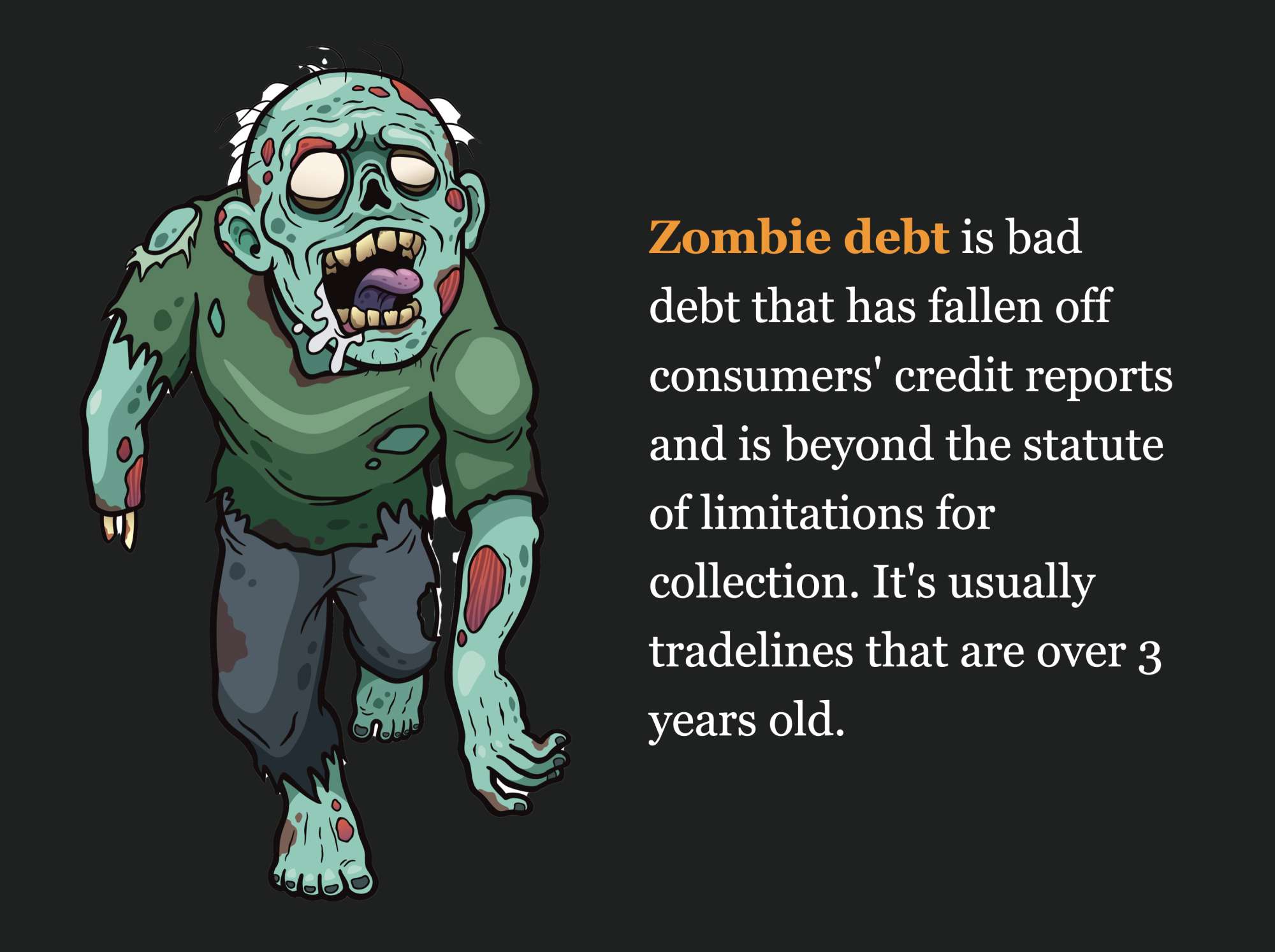 Zombie debt is bad debt that has fallen off consumers’ credit reports and is beyond the statute of limitations for collection. It’s usually tradelines that are over 3 years old.