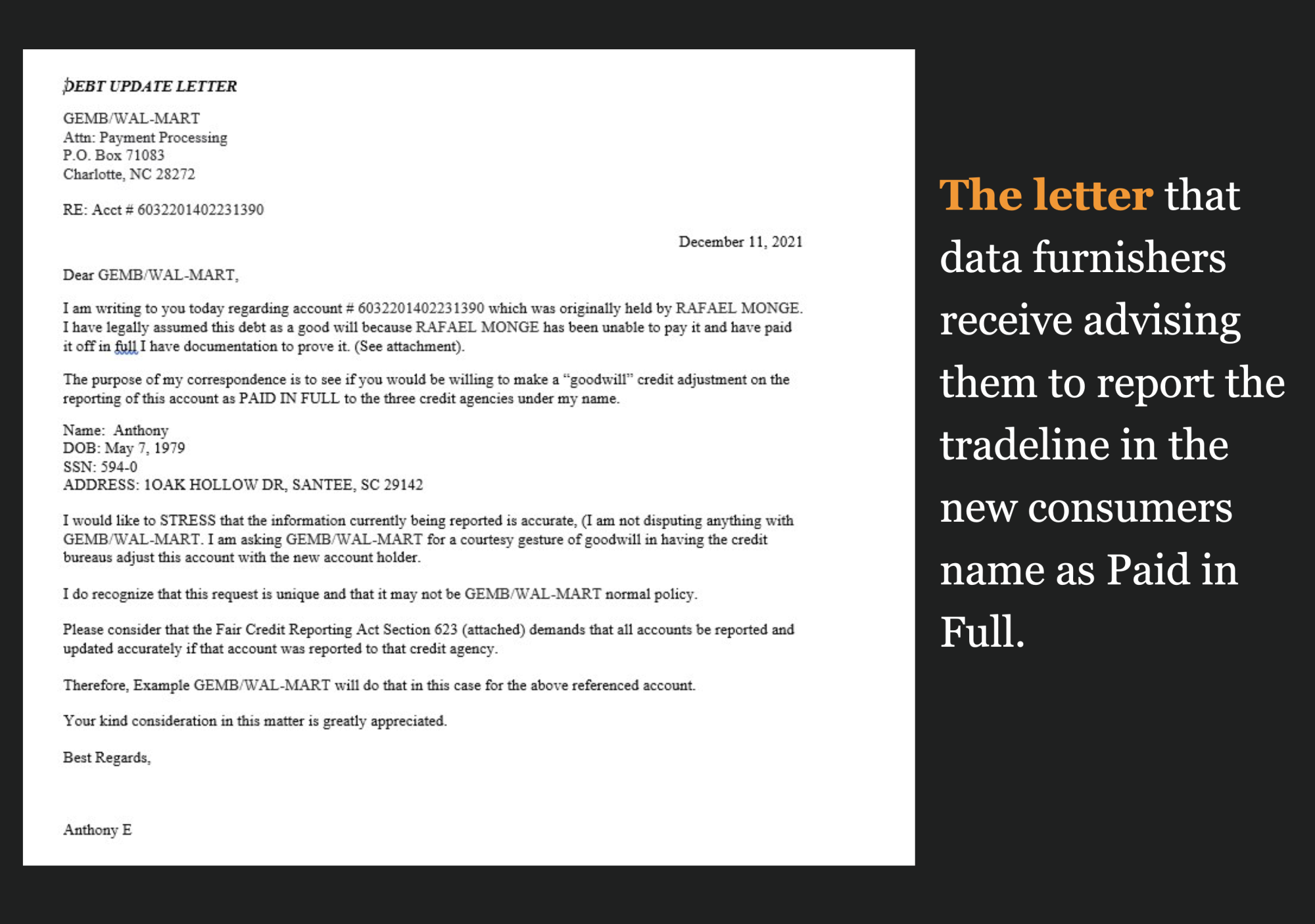 To complete the reassignment of the tradeline to the new consumer, the credit repair company will typically send cut-and-paste letters to the original creditor asking them to update the account and report the new ower of the debt to the credit bureaus.